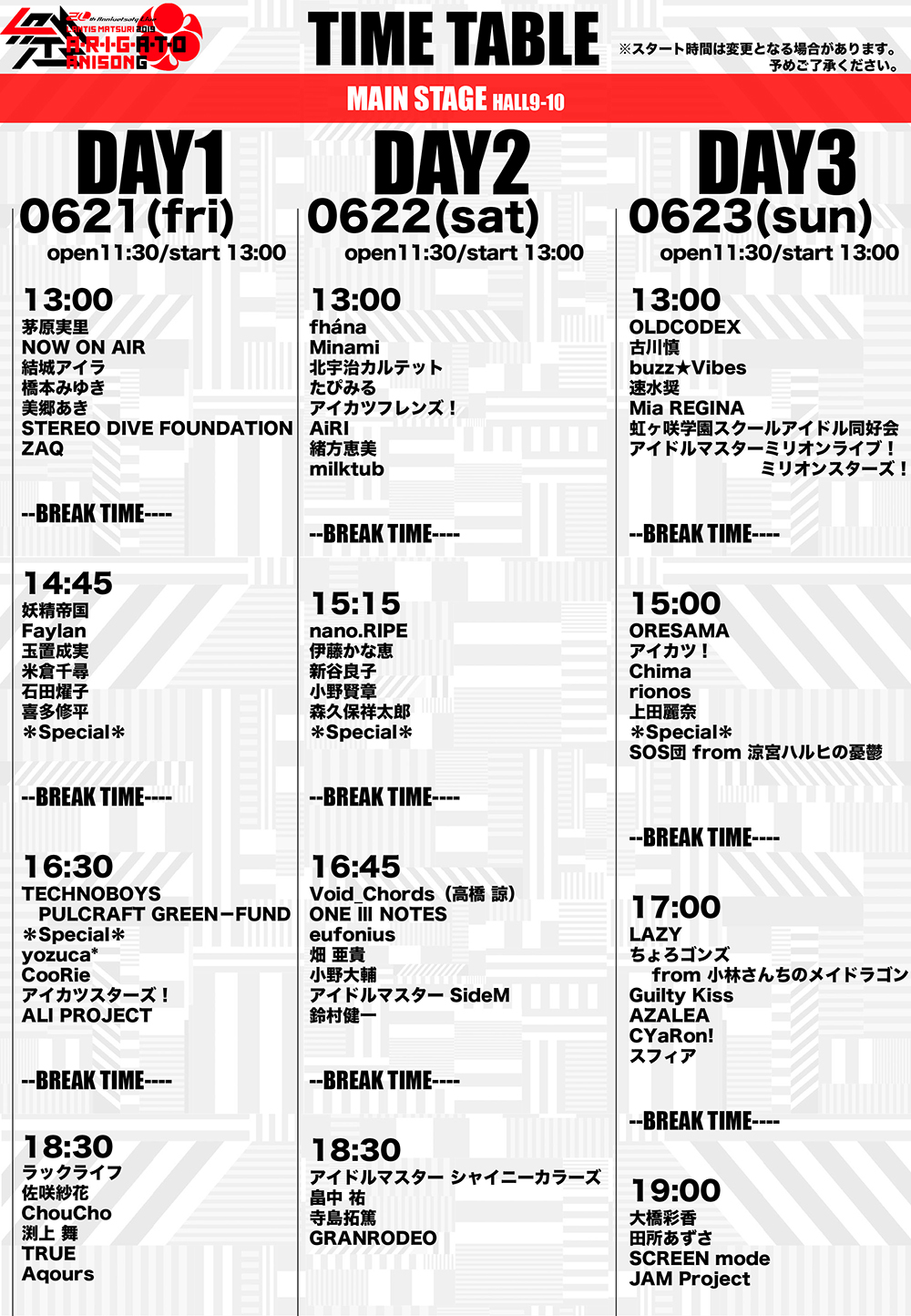 登壇アーティスト:JAM Project、緒方恵美、GRANRODEO、森久保祥太郎、Minami、佐咲紗花、ZAQ、TRUE、fhána、田所あずさ、大橋彩香、Aqours、渕上舞※Aqoursは「伊波杏樹(高海千歌役)・逢田梨香子(桜内梨子役)・斉藤朱夏(渡辺曜役)」での出演となります。