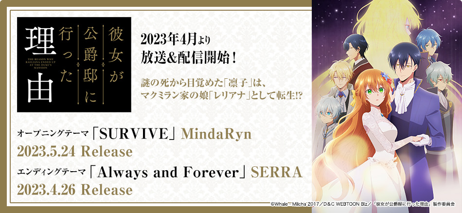 MindaRyn|TVアニメ『彼女が公爵邸に行った理由』オープニングテーマ「SURVIVE」の特典デザインが決定!